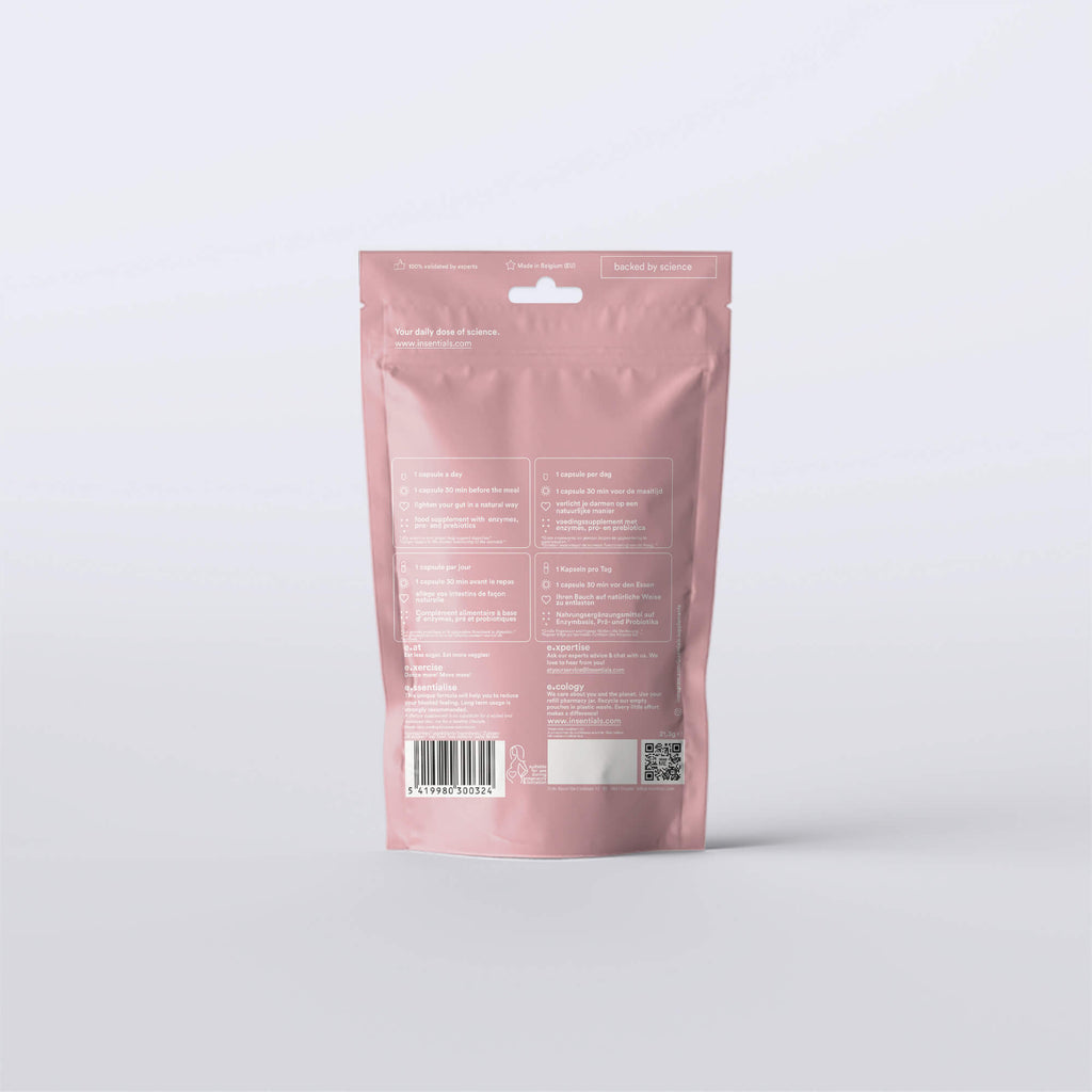 Gewone boon extract (Phaseolus vulgaris), HPMC (capsule), Engelwortel -extract (Angelica archangelica), protease, gemberextract (Zingiber officinale), amylase, mono- endiglyceriden van vetzuren (antiklontermiddel), glucoamylase, lipase, alfagalactosidase, cellulase, Lactobacillus paracasei, rijstzetmeel (vulstof), pectinase, protease, Lactobacillusplantarum, Bifidobacterium animalis, Bacillus subtilis, Lactobacillus brevis, Lactobacillus casei, Lactobacillus rhamnosus, kopercomplexen van chlorofylinen (kleurstof), Bacillus coagulans, xylanase, Lactobacillus acidophilus, Lactococcus lactis, hemicellulase.